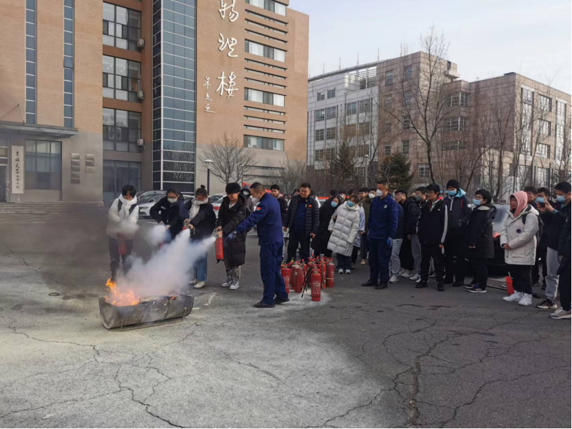 讲座结束后,保卫处消防科同志为师生们开展了疏散、安全防火演练。警报拉响后,消防人员组织师生掩护口鼻穿过浓烟,迅速有序的从楼两侧安全通道撤离至楼前安全地带。疏散结束后消防人员为师生示范并详细讲解灭火器及灭火毯的使用方法,师生们非常积极踊跃参与到实际操作中。