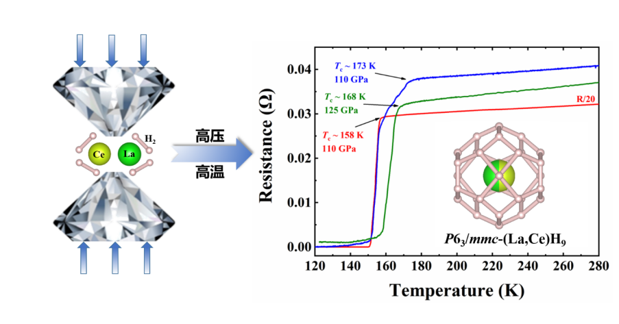 图:高压下 (La,Ce)H9的超导转变和结构示意图。