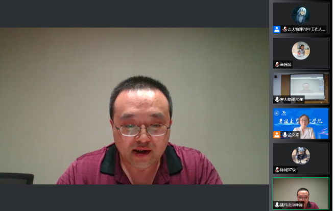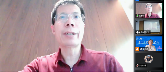校友会顾问邹广田院士做了致辞。邹先生深情回忆了老一辈物理学家艰苦卓绝的奋斗历程,特别提到了陈佳洱院士当年用只有一个眼镜腿的眼镜学习。当时条件艰苦,去教室和实验室学习还需自备板凳。