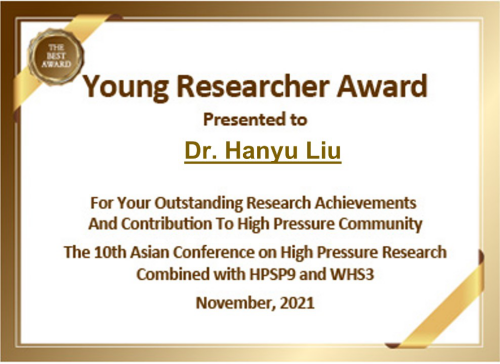 计算方法与软件国际中心刘寒雨教授,以表彰其在高压科学领域的杰出成就和突出贡献。“亚洲高压会青年奖”每两年评选一次,刘寒雨教授是2021年度该奖项两位获奖人之一。