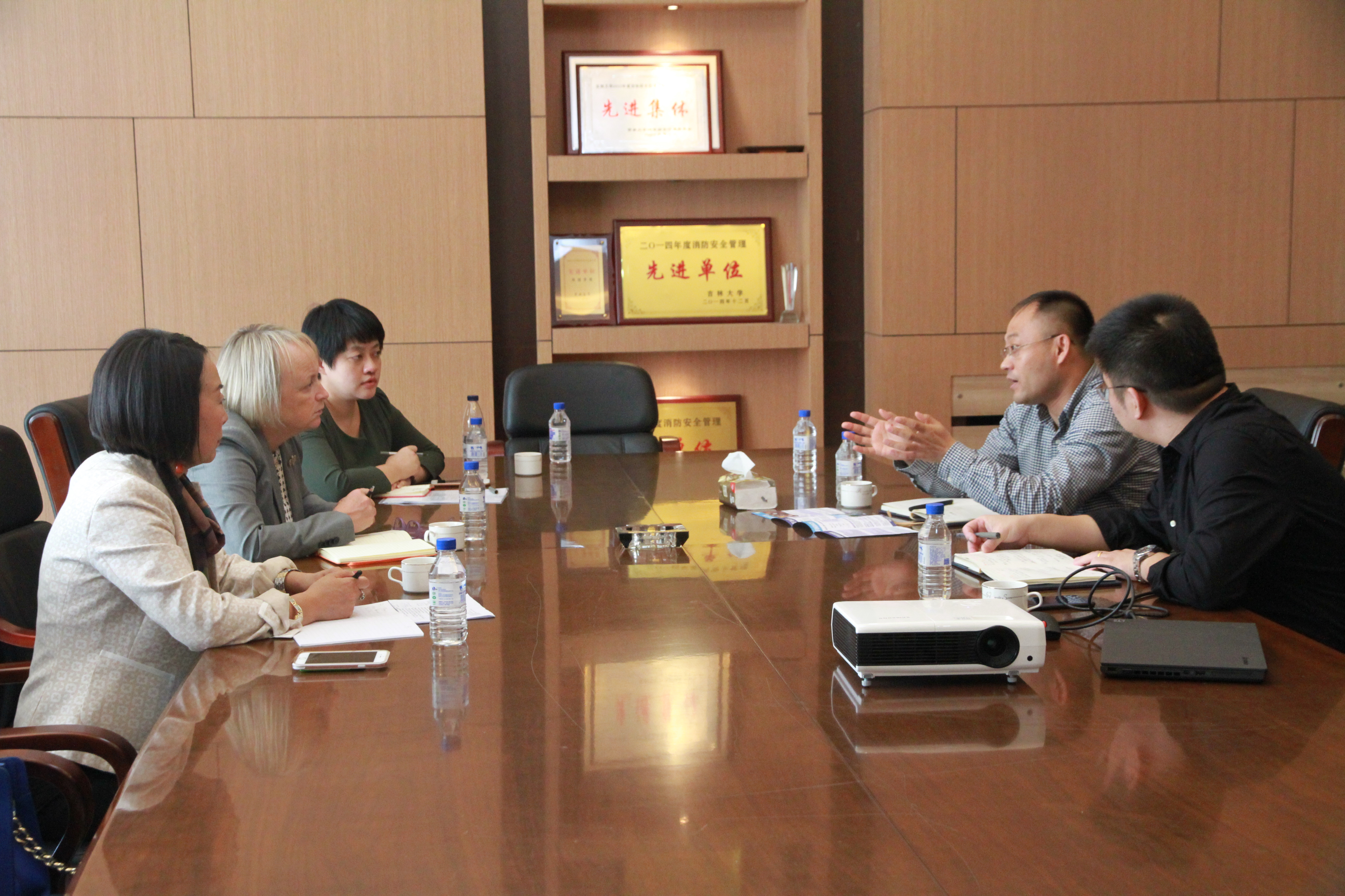 马琰铭院长、杜菲副院长在国际合作与交流处白茵老师的陪同下,与美国肯塔基大学副教务长Sue Roberts、肯塔基大学孔子博彩App