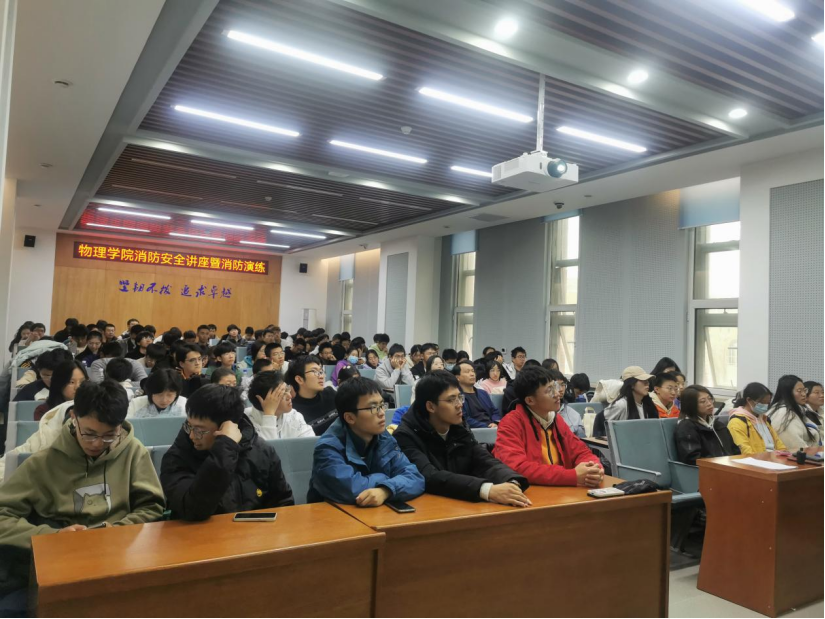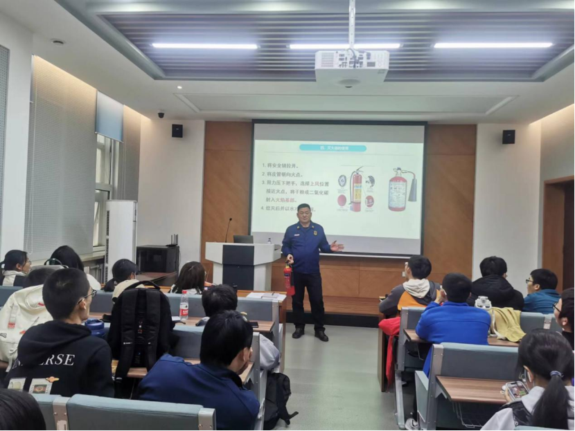 保卫处董立明从消防安全工作的意义、落实安全制度,强化安全管理、消防器材使用、消防逃生能力及方法五个内容进行讲解。为加强警示作用,董立明结合高校火灾事故典型案例,播放了大量视频,并深刻分析了火灾事故的原因,呼吁师生重视消防安全,提高消防安全意识,加强火源管控和用电管理,强化预防,确保师生生命安全。