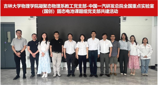 党委委员、新型电池物理与技术教育部重点实验室主任杜菲,凝聚态物理系教工党支部书记李子亨等,前往中国一汽科技创新基地,与中国一汽研发总院全国重点实验室(国创)固态电池课题组党支部联合开展共建活动。中国一汽研发总院全国重点实验室(国创)固态电池课题组党支部书记、组长孙焕丽以及双方部分党员和科研骨干共同出席了在该基地举行的共建启动会。