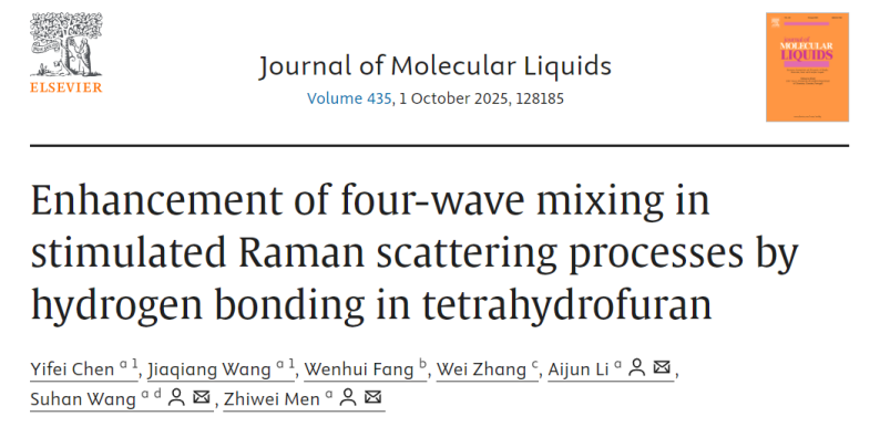 2022级本科生陈奕霏等在门志伟教授的指导下,在氢键调控四氢呋喃(THF)混合溶液受激拉曼散射 (SRS)增强四波混频(FWM)过程取得进展。研究成果以“Enhancement of four-wave mixing in stimulated Raman scattering processes by hydrogen bonding in tetrahydrofuran”为题发表于《Journal of Molecular Liquids》上(DOI: 10.1016/j.molliq.2025.128185)。