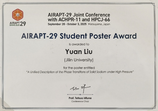 博士研究生刘源,在刘寒雨教授与谢硕(John S. Tse)教授的联合指导下,凭借其在高压下碱金属钠电子化合物方面的创新研究成果,以及在会议期间的出色展示与交流表现,脱颖而出,获得“AIRAPT-29学生海报奖”。
