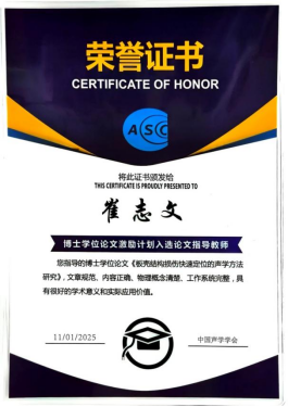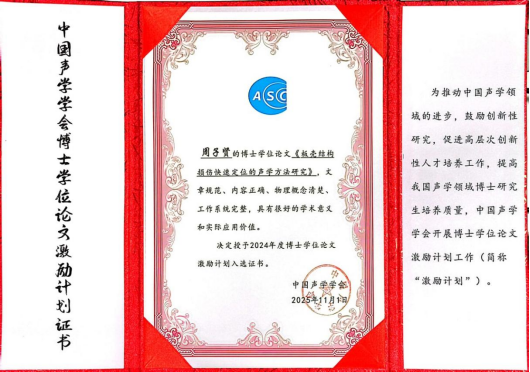 声学研究团队2024届博士毕业生周子贤的博士学位论文《板壳结构损伤快速定位的声学方法研究》入选2024年度“中国声学学会博士学位论文激励计划”,他的论文指导教师崔志文教授也因在研究生培养工作中的突出成绩,荣获“博士学位论文激励计划指导教师”称号,并在2025年全国声学大会受到表彰。