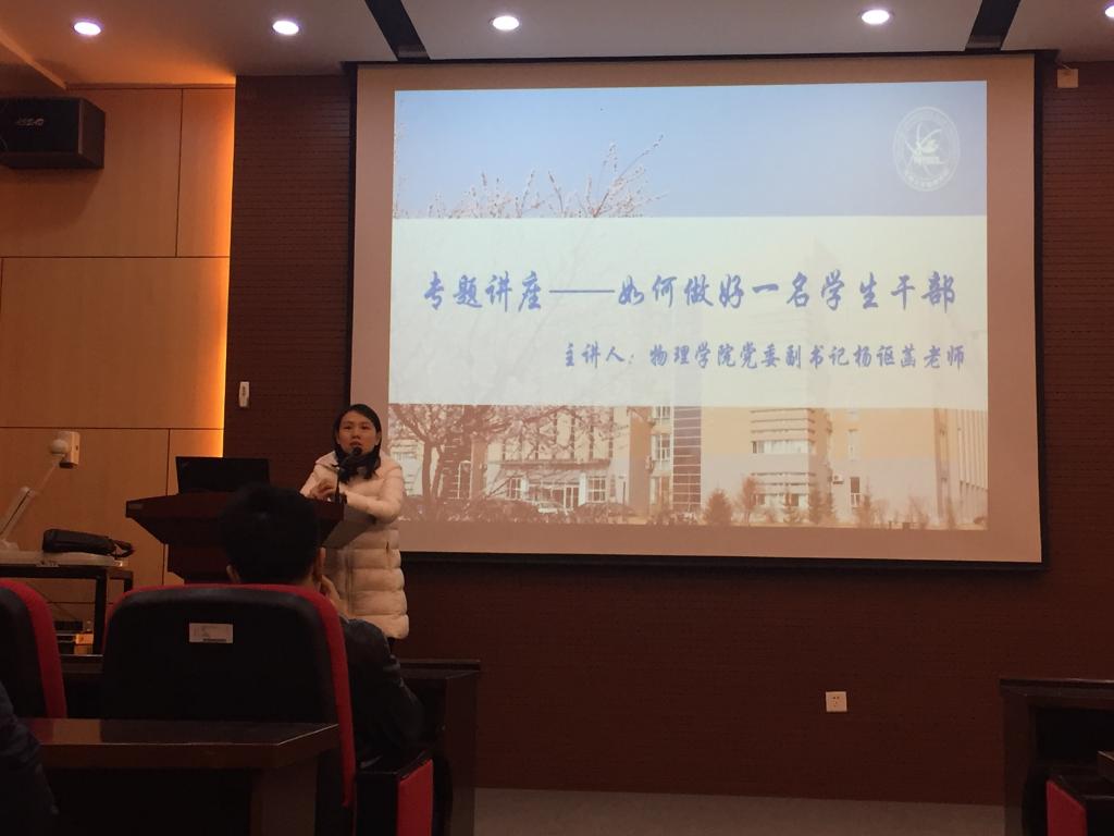 党委副书记杨讴菡老师结合自身的经验以“如何做好一名学生干部”为主题为所有学生干部做了一场生动的讲座。杨讴菡老师从学生干部必须具备的“六大意识”即大局意识、责任意识、作为意识、学习意识、服务意识和反馈意识展开阐述和介绍。运用多个案例深入浅出的分析了在学生干部工作、学习、成长成才过程中的必要性和重要性。