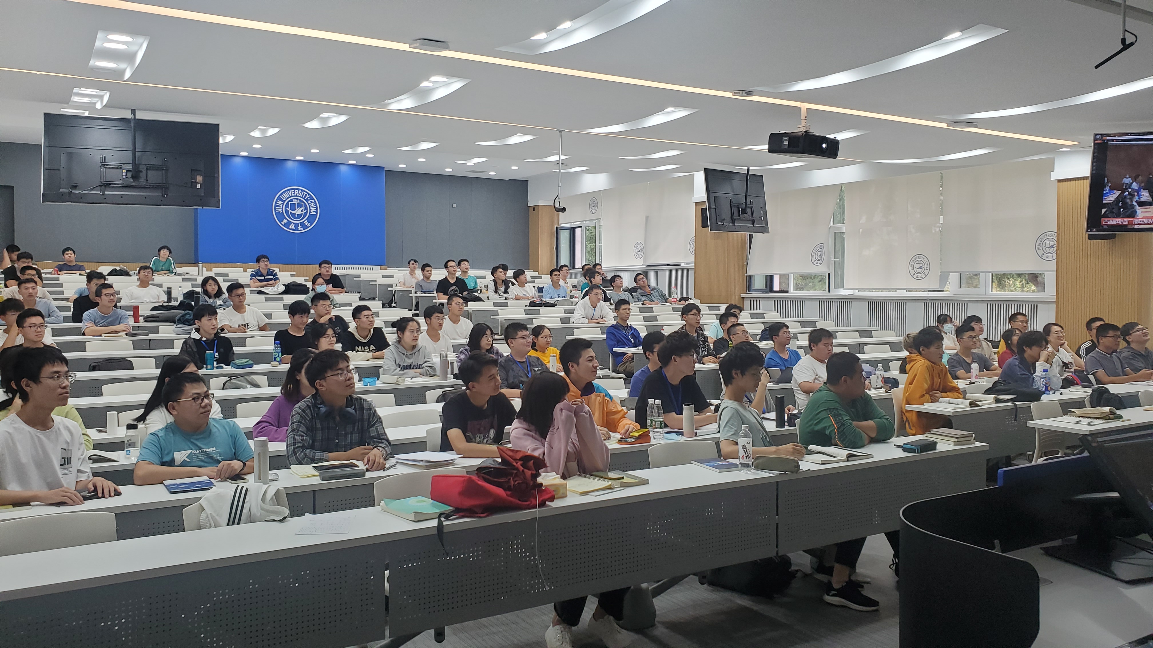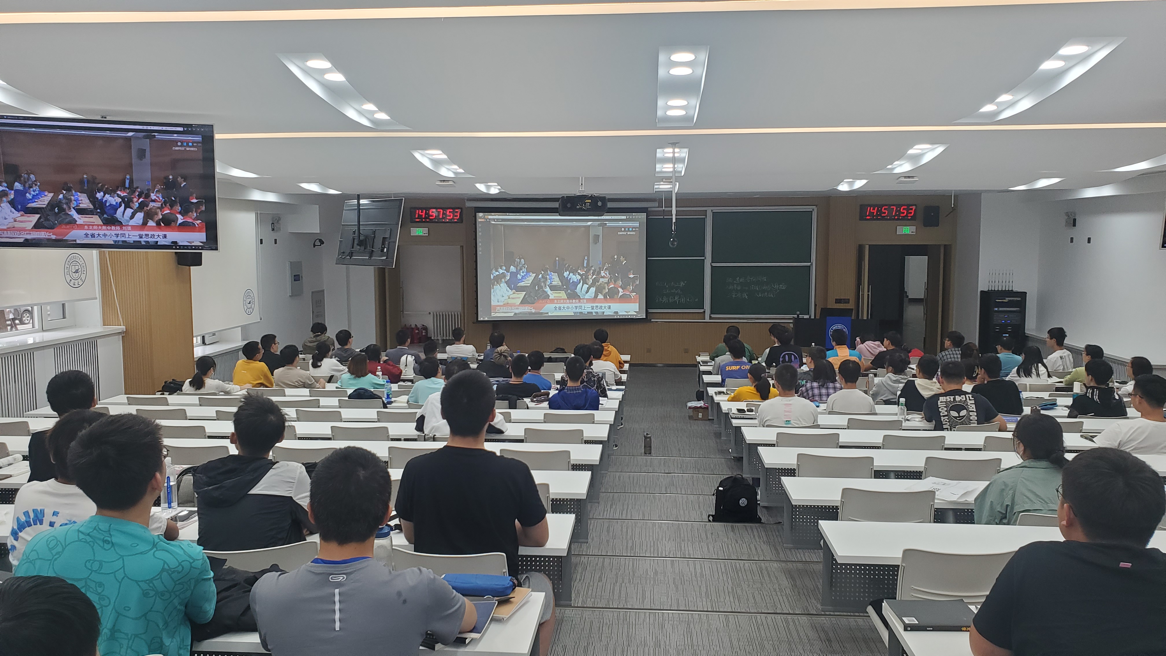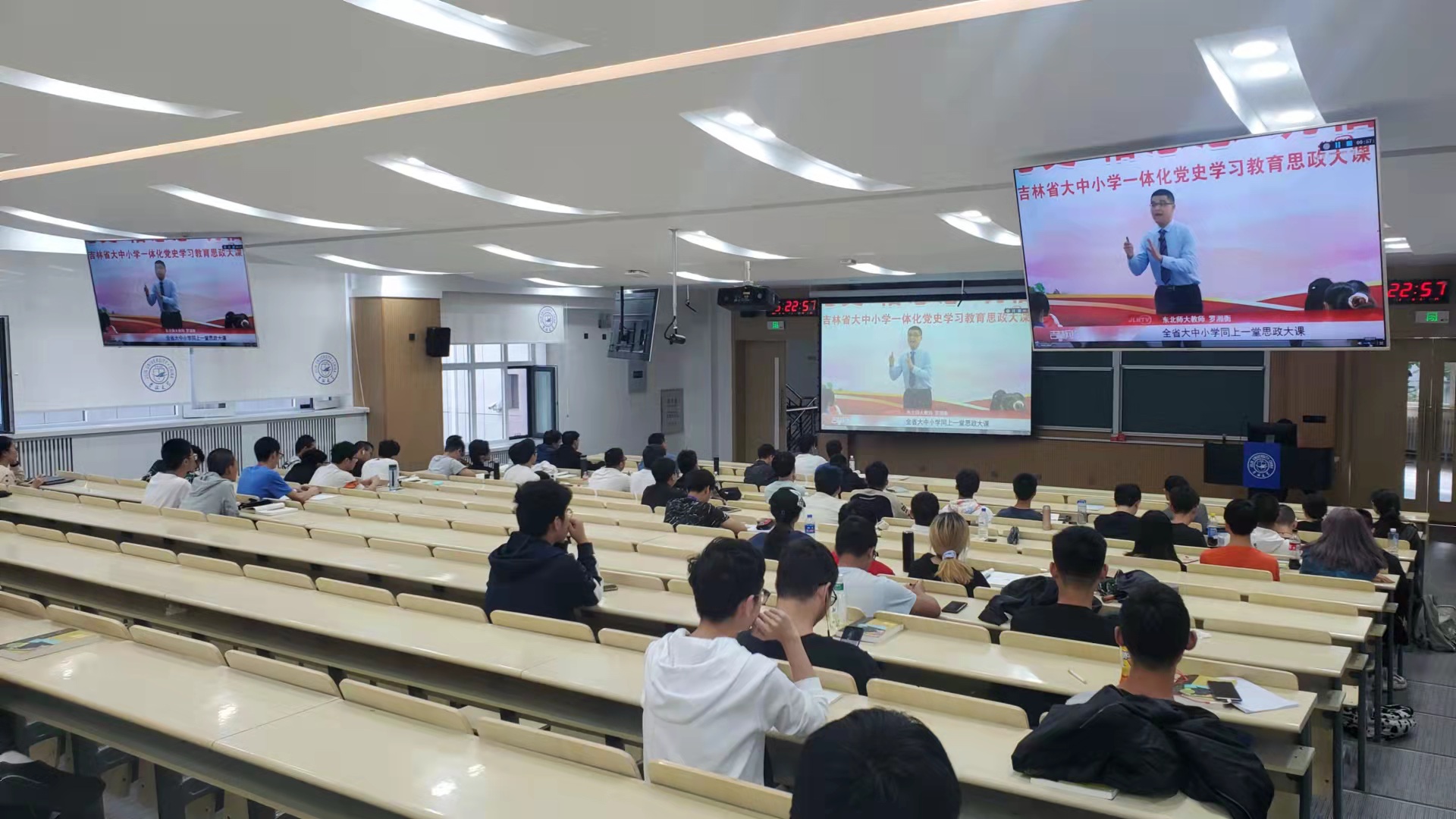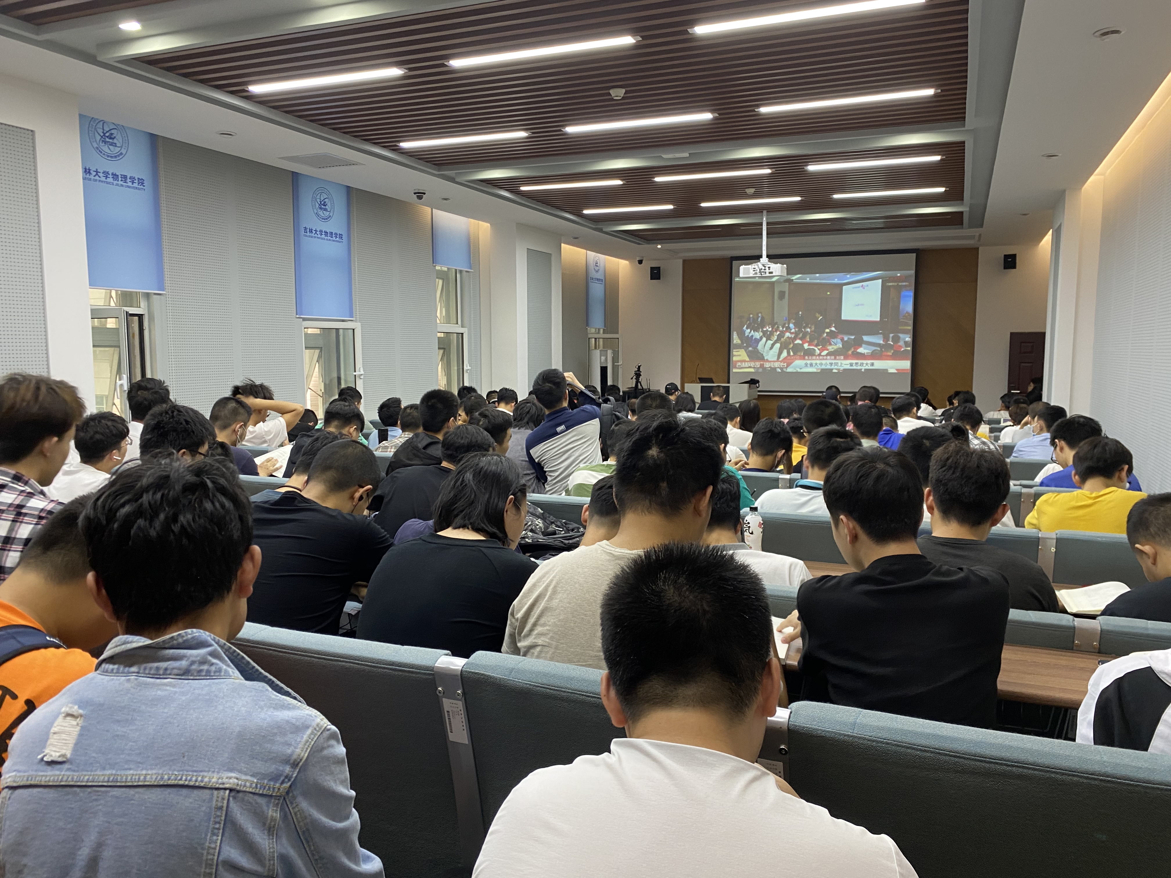 当天下午两点二十分,学生们在辅导员老师的组织下,在逸夫楼4阶、8阶教室和物理楼333分别设置分会场。课堂上,同学们认真聆听了东北师大附中三位老师进行的党史教育,吉林省委书记景俊海、省委副书记省委教育工委书记高广滨对吉林全省大力推行党史教育的重要性讲话,以及对全体青少年同学的殷切嘱托。