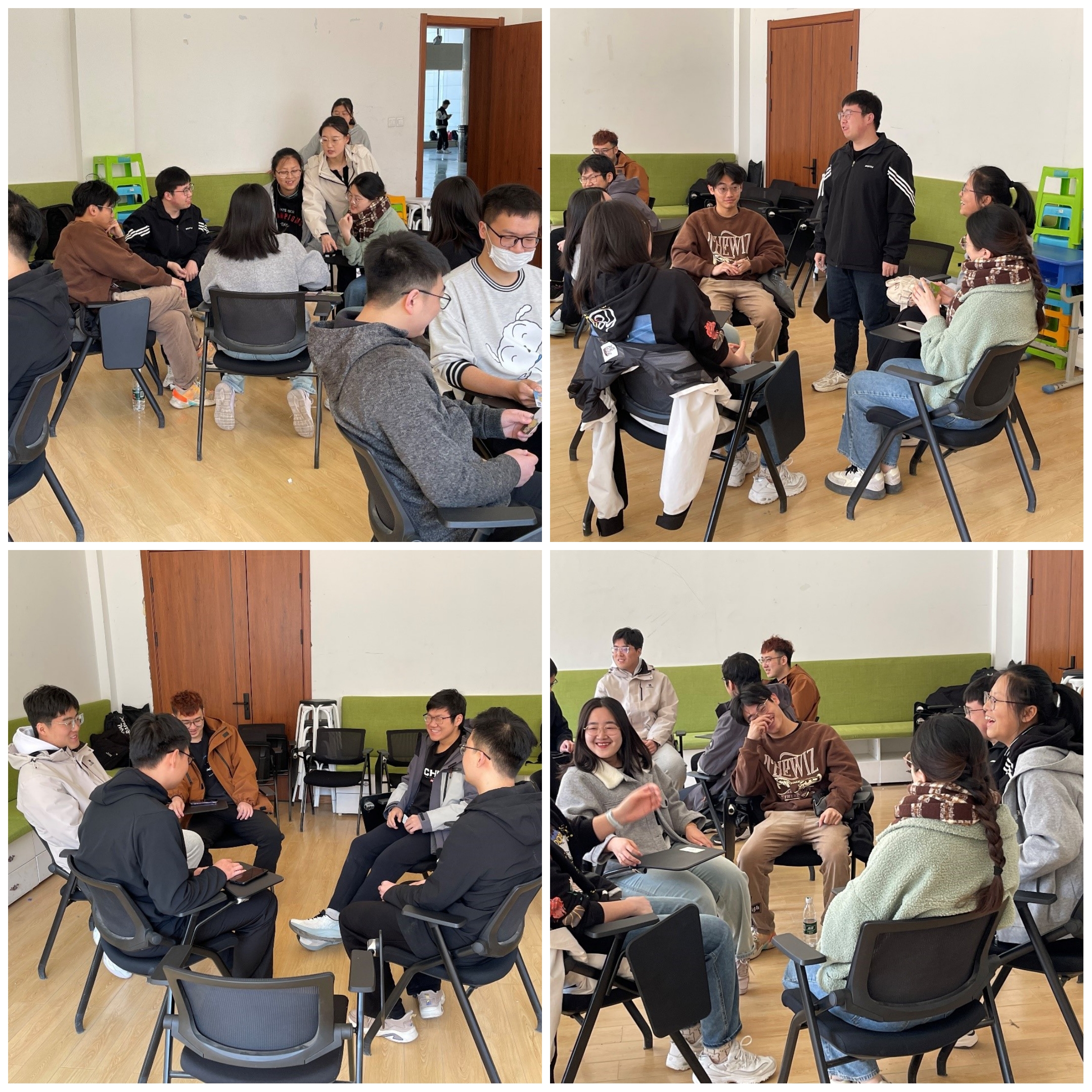 活动由四部分组成,分别为自我介绍、“情绪大头贴”、“故事串演”以及会议总结。各个环节层层递进,让积极的情绪如流水一般冲刷过每位学生的心灵,让参与者逐渐打开心扉,直视内心,表达自我。在自我介绍环节中,同学们热情洋溢地介绍了自己,在交流中逐渐加深了对彼此之间的了解。随后的“情绪大头贴”“故事串演”环节中,组织者将情绪卡背面向上,让所有参与者随机抽取一张卡片并保密,以人体雕像或者语言描述的形式先后表演出卡面上的情绪内容,由组内其他成员猜,待组内所有的情绪卡全部猜出后,将组内的情绪卡内容串演成一个小故事,同学们充分发挥自己的创造力和表演才能,活动中笑声不断。最后环节,同学们逐渐打开心扉,有的同学主动说出了自己的烦恼和困惑,大家一起出谋划策提供多元视角帮助解决,最终“心灵沟通”主题班会活动在同学们心与心的碰撞中圆满落幕。