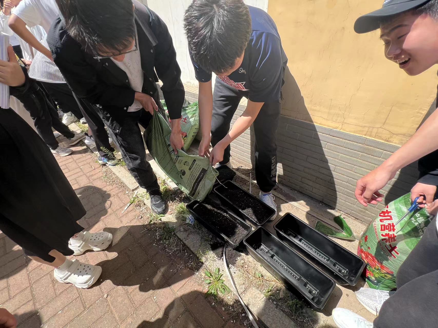 老师的带领下进入规定区域进行蔬菜种植。到达指定区域后,学生们首先对区域内的杂物和杂草进行清扫整理,之后进入播种环节,学生首先在辅导员老师处领取每组的种子和肥料,之后将种子播撒在每组的育苗盆内,浇水施肥,在育苗盆外侧张贴分组标签,最后同学们整理好劳动工具,将整个劳动过程中产生的垃圾扔到指定位置,有序离开划定区域。