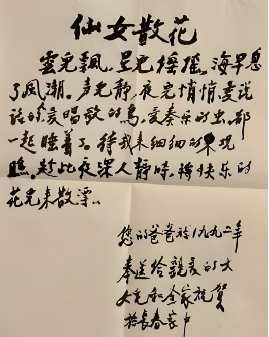 系年纪较大的老师,不少人大概听过他唱岳飞的《满江红》。邹广田老师在父亲90岁生日的题词上写过,父亲“高歌满江红“。小时候,父亲教我唱过一首歌,名叫“仙女散花“(云儿飘,星儿摇摇…)。