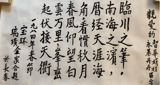 父亲性格乐观开朗,兴趣广泛。他喜爱唐诗宋词,看书累了便在书房里边踱步边用江西调吟诗,据说几乎能背《唐诗三百首》一半。我记得小时候他教我的第一首唐诗是王维的《鹿柴》:“空山不见人,但闻人语响。返景入深林,复照青苔上。”父亲偶尔也写诗。1984年春节,全家难得团聚,我们请父亲为每个小家庭用毛笔写一首自己的诗作纪念: