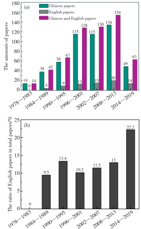 图2为从事余氏理论的研究者在1978—2019年间国内、国际期刊发表相关论文的情况。总体看,有关余氏理论的被发表的研究论文还比较少,共计在600篇左右(图2a);在1996—2013年期间,有关余氏理论方面的论文数达到最大值,每五年在120~150篇左右,而最近几年又呈现明显下降趋势。这可能是因为在1996—2013年间,从事余氏理论研究的科技工作者较多,获得经费资助也相对较多,而在近几年中从事余氏理论的研究者获得经费资助的机会比较少,因此从事该方面研究的热情和人员显著下降,相关方面的科技论文发表也比较少。另外,从图2b可以看出,余氏理论方面发表的英文论文篇数占发表论文总数仍不足25%,这也是余氏理论发展缓慢的主要原因之一;但是余氏理论从建立到如今,其英文论文的数量还是逐渐提高的,尤其是在2014年以后余氏理论方面的英文论文数量增加近2倍,这也表明余氏理论的影响力还是逐渐提升的。
