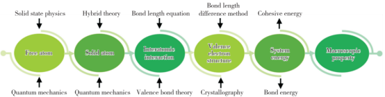 余氏理论打破了化学和物理学科的界限,将价键理论、量子力学及固体物理学等进行了衔接与互补,实现了从自由原子状态到实际固体中原子状态及原子间相互作用的表征、推演及求解。图1给出了余氏理论体系的结构图。从图1可以看出,余氏理论从自由原子状态的描述出发,给出了固体中原子(受约束原子)的描述方法,改进了描述原子间相互作用势的键距方程,建立了描述多体系原子间相互作用的原子精细价电子结构及体系能量,从而利用精细价电子结构及体系能量实现对体系宏观性质的描述与表征。