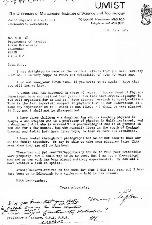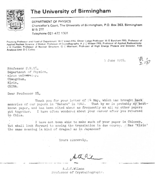A.J.C.Wilson和H.Lipson写给余瑞璜的信(复印件)