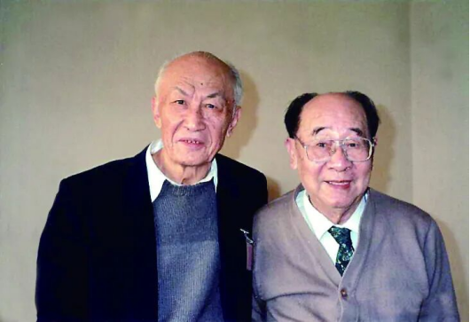 朱光亚(左,1952—1955年任东北人民大学物理系教授、代系主任)与老友余瑞璜(右)合影 1995年10月